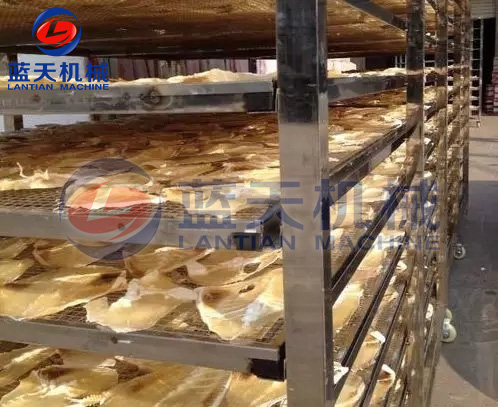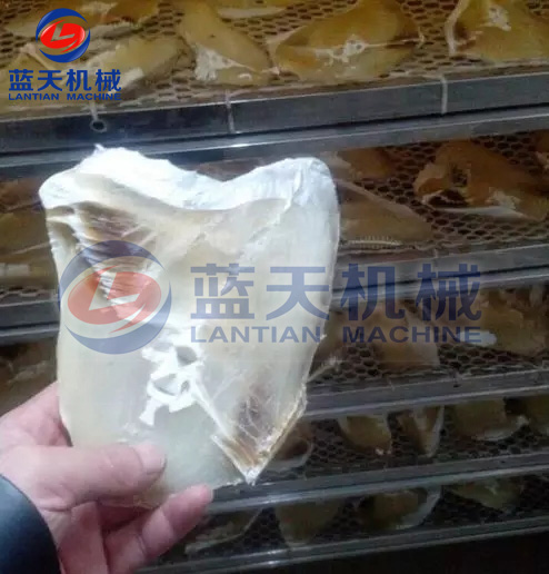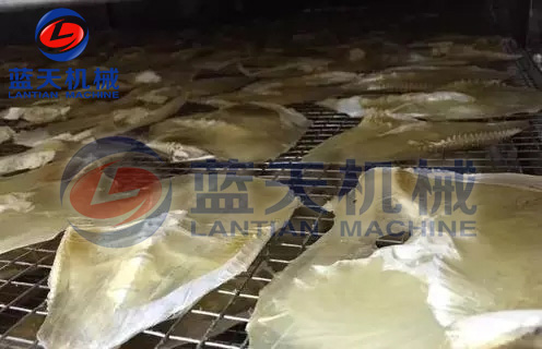 4、烘干:將魚體洗刷一次,除去沾染的污物,滴干水后,排放于特制的烘干盤上。推進(jìn)熱泵烘干房,開(kāi)啟主機(jī)的控制面板進(jìn)行烘干,烘干過(guò)程由電腦版全自動(dòng)控制,無(wú)需人工值守,一般海魚的烘干時(shí)間在22——28個(gè)小時(shí)左右。
