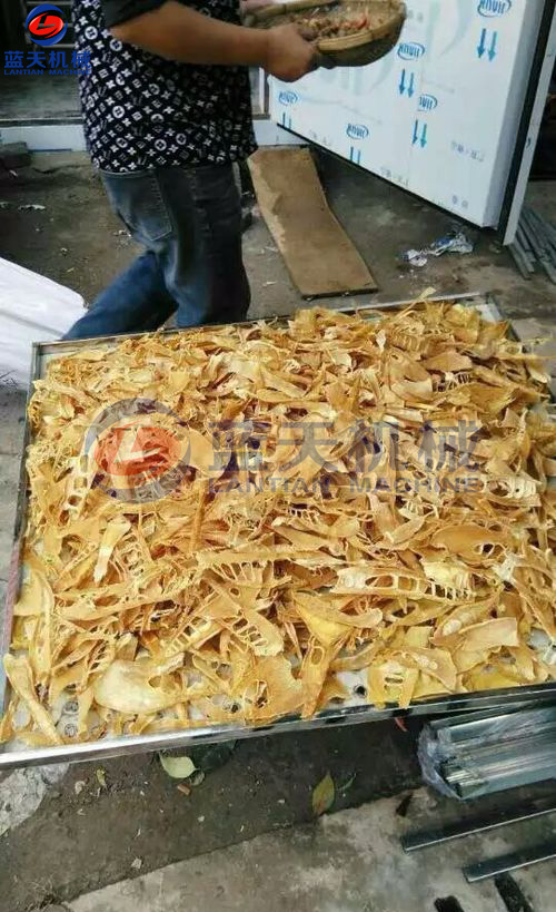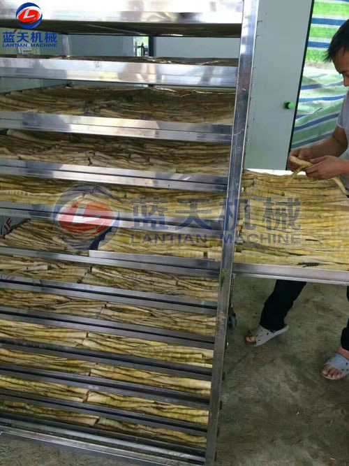 壓制好的片狀竹筍裝入物料車托盤,進入烘干房進行烘干。