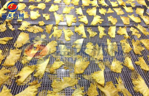 第三步:切好的菠蘿片進入熱泵烘干系統里烘干的過程,可以分成5段完成,第一段,烘干,不除濕,時間1.5個小時,內外溫度一致,溫度50度,第二階段,溫度53度,開始連續除濕,除濕到40%,第三階段溫度58度,連續除濕,濕度26%,第四階段溫度55度,濕度20%,連續除濕,第五段溫度48度,濕度18%,連續除濕1小時,烘干完成。