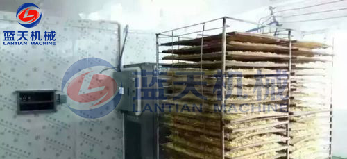 黃姜的烘干單批次重量較大,一般清洗后采用切片機進行切片,厚度在3-5毫米左右,然后裝入物料盤,推入烘干房,2臺12P主機配11.5米長4米寬2.2米高烘干房每次進物料車18臺,每臺可以放黃姜片300斤,總共一批次可以放入5400斤新鮮黃姜片,黃姜片含水量較大,系統需要每邊配置2臺新風閥,溫度從55開始進行提升,每批次烘干總耗時22小時,每小時用電30度,總用電660度,按照每度電1元計算,每斤新鮮黃姜片的烘干成本是0.12元。