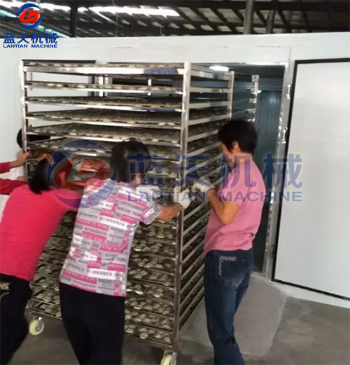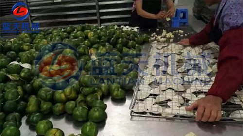 2剝好的陳皮由車間工人集中運至裝料區,由裝料工人開始裝入物料托盤,上物料架,馬上要準備大批量烘干咯。