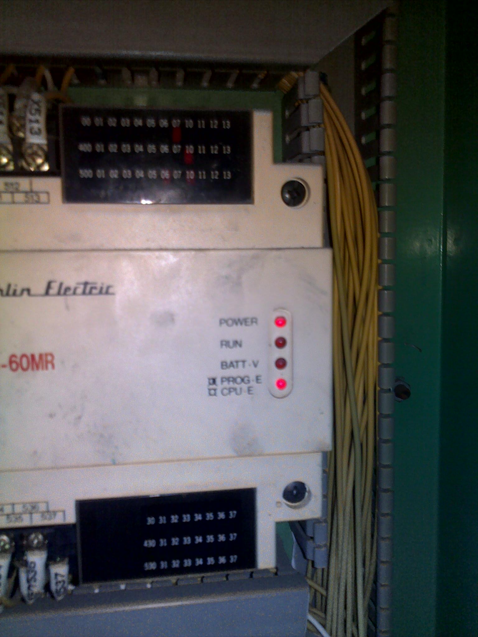 士林老式PLC,BATT-V燈亮了就表示電池沒電了,電池沒電程序就會丟失,所以CPU-E,PROG-E的燈還會閃。可以到別臺拷一份程序灌進去。你這應該是沖床上用的吧?