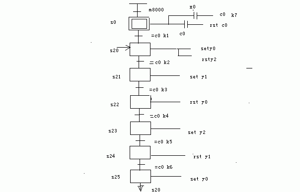 用步進(jìn)指令,同一按鈕X0,每按一次一步,為A-AB-B-BC-C-AC-A循環(huán)。圖可行嗎?Y0,Y1,Y2,分別對應(yīng)A,B,C。現(xiàn)在問題是A要多走一步如何改進(jìn)?