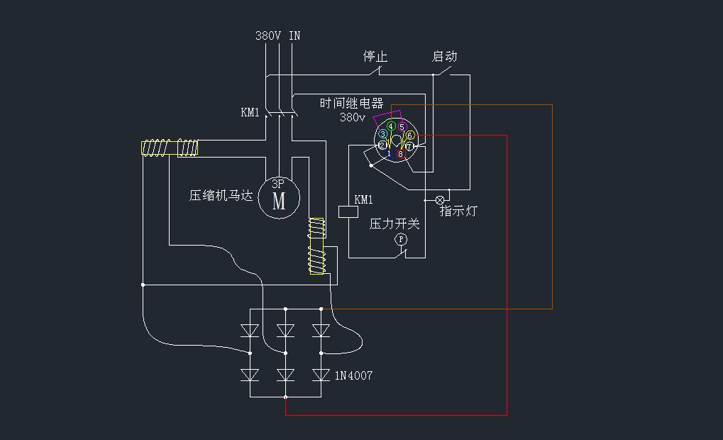 圖中的時間繼電器,1同3,8同6是常開觸點。1同4,8同5是常閉觸點。3同5是相連的。