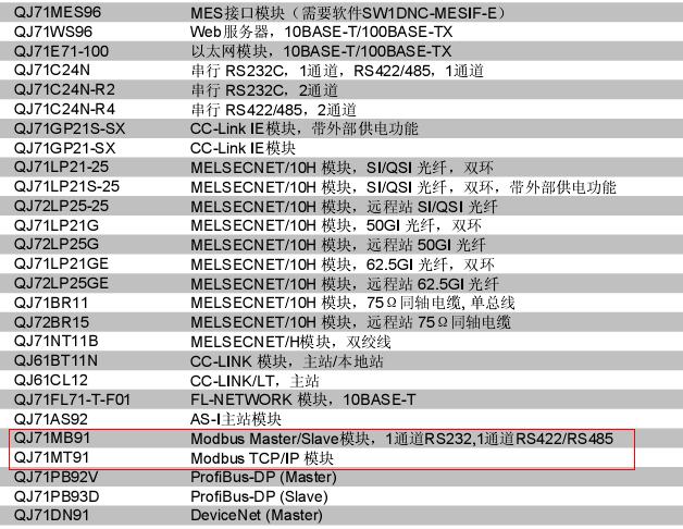 Q系列的PLC中有modbus模塊QJ71MB91或QJ71MT91