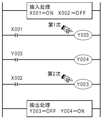 在順控程序中輸出線圈被多次驅(qū)動(dòng)成為雙重輸出(雙線圈),出現(xiàn)該情況時(shí)其觸點(diǎn)狀態(tài)以程序當(dāng)前邏輯狀態(tài)為準(zhǔn)。兩個(gè)或多個(gè)線圈的狀態(tài)容易相互干擾,進(jìn)而影響編程人員對(duì)程序執(zhí)行結(jié)果的判斷。