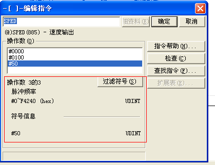 如圖, 我用的是CP1L 型號的 在用SPED脈沖指令時,發現前面2個數據很清楚含義!就第3個有點不清楚,我現在寫的#50,是不是指的就是頻率是50還是要算成16進制的!紅框框里的解釋不明白了,請大大指點。!