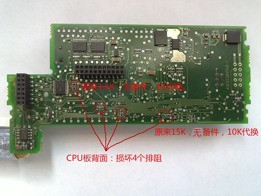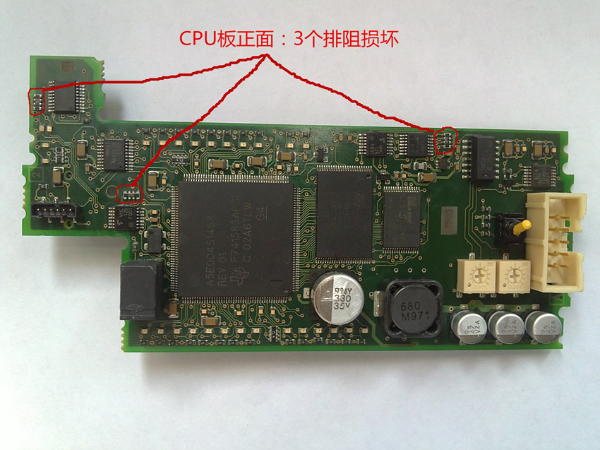 接著,檢測(cè)電路板上的電阻,發(fā)現(xiàn)有7個(gè)排阻損壞,全部更換后(有2個(gè)排阻,分別是1.5K、15K,沒(méi)有相同型號(hào)代換,使用接近的排阻代換),上電,故障現(xiàn)象不變,再次使用“wipeout”恢復(fù)出廠,RUN運(yùn)行燈亮,測(cè)試所有I/O點(diǎn)、擴(kuò)展口,正常,故障排除。