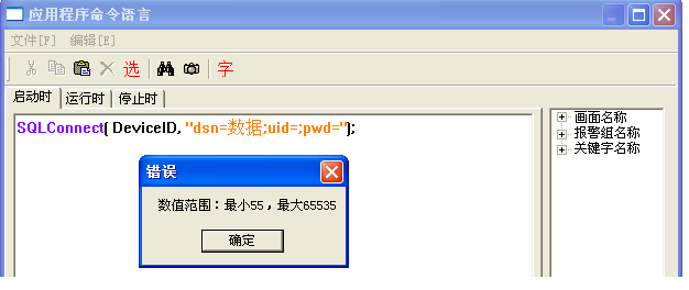 命令語言——應用程序命令語言——啟動時:SQLConnect( DeviceID, "dsn=數據;uid=;pwd=");   —— 確認“彈出錯誤,數值范圍:最小55,最大65535是哪不對? 哪位大神幫忙看看,謝謝!!