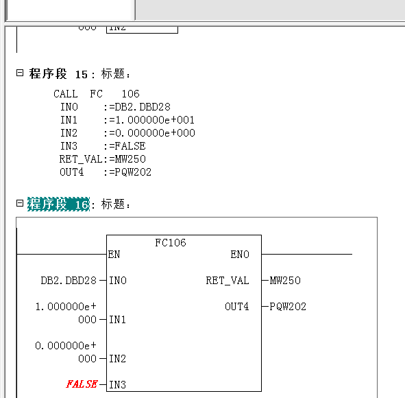 哪位大師能幫我解釋一下FC106的問題啊?圖中程序段15是源程序,程序段16是我弄的,這個IN3=FALSE是怎么回事?語句表能弄出來梯形圖為什么弄不出來?