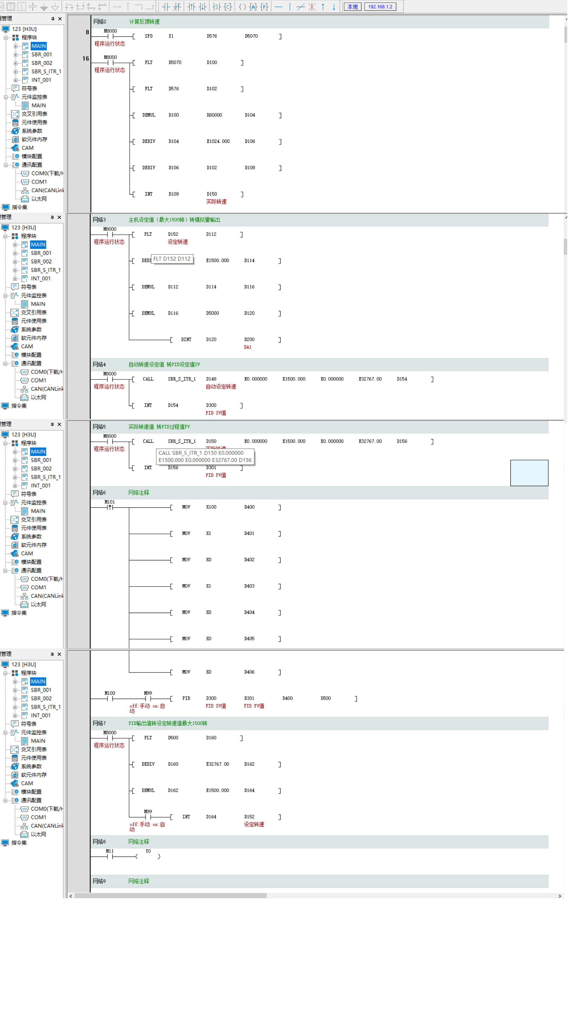 工況說明:變頻器驅(qū)動電機轉(zhuǎn)動,電機加裝編碼器反饋給PLC,做為PID控制器的PV值,與設(shè)定值SV(轉(zhuǎn)速)進行PID運算,輸出控制變頻器,使電機穩(wěn)定在SV值運行。(匯川3U的PLC)