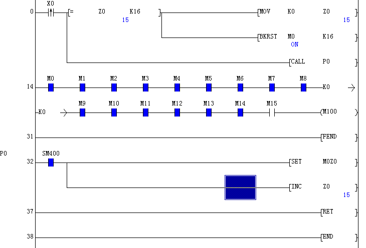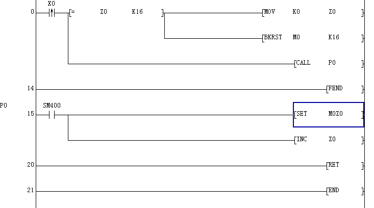 2、FX2N的基本指令不支持變質,應用指令支持。所以[SET M0Z0]就不能用了。可以用譯碼指令[DECO Z0 M0 K4]。不過這樣寫的話,不用Z0也行,隨便一個字元件,想D100什么的都行。