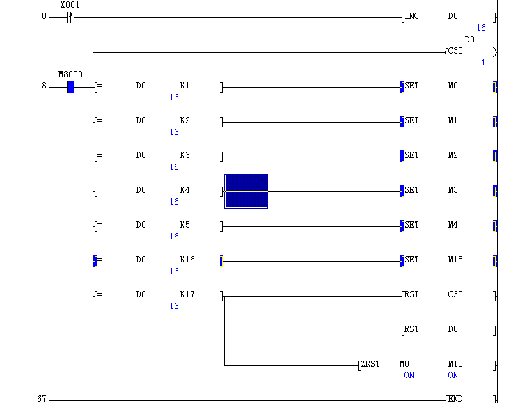 你好,樓上的朋友,用DECO指令,只能使M0-M15輪流被置位(即輸出向下一個高位M移動,而沒有保留以前被置的位);而現在想達到的目的就是當輸入被接通時,M0-M15依次被置位(保留以前被置的位不變).演示結果如下: