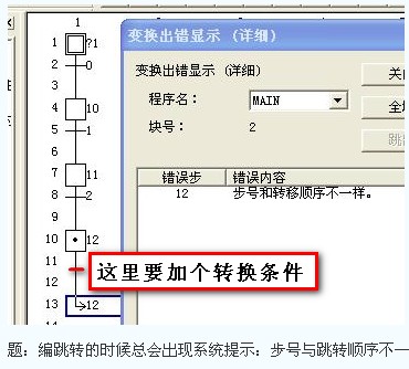 我在用三菱編程軟件編功能圖的時候遇到了這樣的問題:編跳轉的時候總會出現系統提示:步號與跳轉順序不一樣!不知道是什么原因?但在編分支或并發的時候卻正常著。