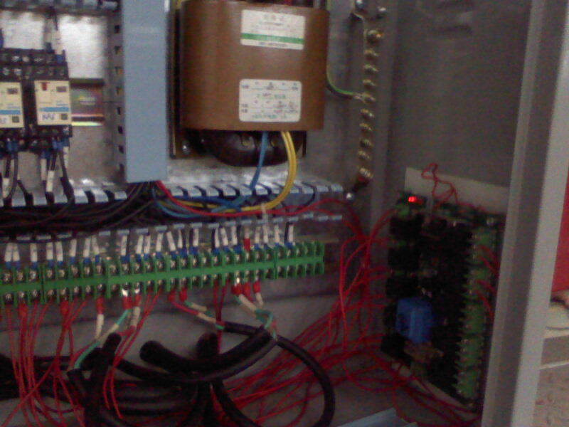 其中,接收模塊裝在控制柜中(如圖示),遙控器裝在伸縮機前端的控制盒中,并且遙控器上的按鈕全部用排線引出接