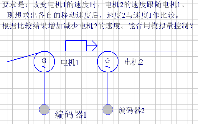 現要求兩臺變頻器控制兩臺電機的速度達到同步,因兩臺電機輸出軸連接的機械尺寸不同,此種情況如何控制?如用 模擬量,現假設電機1的速度為2000mm/秒,(0-10v對應0-4000)輸出5v電壓給電機2,怎樣控制電機2為5v 輸入時速度也是2000mm/秒?見圖: