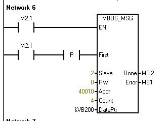 你這個(gè)程序還蠻復(fù)雜的,掛了9個(gè)從站(3~11號(hào)站),調(diào)用了19個(gè)MBUS_MSG指令。你這19個(gè)MBUS_MSG指令都是同時(shí)執(zhí)行的(都用SM0.0使能),肯定出錯(cuò)(錯(cuò)誤代碼6)。應(yīng)該參考幫助里面的程序,讓每個(gè)MBUS_MSG指令輪流執(zhí)行,執(zhí)行完一條MBUS_MSG指令就將激活該MBUS_MSG指令的位復(fù)位并激活下一條MBUS_MSG指令,如下圖: