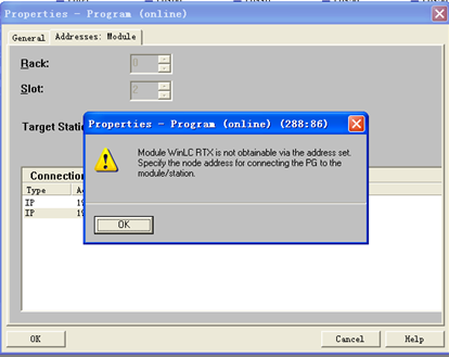 在下載更新程序時出現如下:Module WinLC RTX is not obtainable via the address set. Specify the node address for connecting the PG to the module/station.