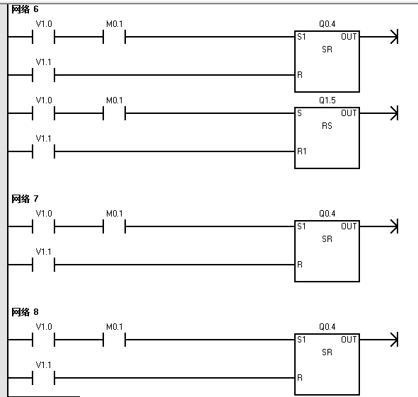 但是RS觸發器指令盒有兩個輸入引腳,如果RS/SR觸發器指令的引腳條件相同時,能否將多個RS觸發器指令盒也寫在一個網里面呢?還是說類似于RS觸發器指令有兩個以上輸入引腳是,也必須要另外新建網絡。如下圖所示: