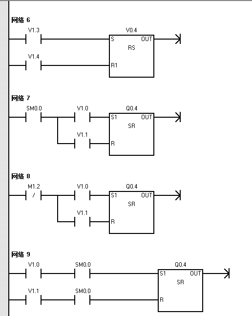 請教各位:我是西門子PLC的一個初學者,以前一直用三菱的PLC,在編梯形圖的時候沒有遇到以下情況。西門子的一些命令,如RS觸發器,前面必須要連到左母線上去,連接一些觸點或者輔助繼電器都不行,請見下圖。