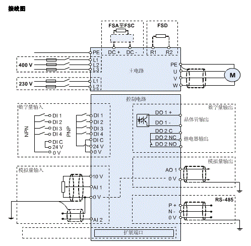 通過變頻器內(nèi)參數(shù)調(diào)整,可以對DI1--DI4端口進(jìn)行設(shè)置,分別為正反轉(zhuǎn)及固定頻率,接線圖如下圖所示