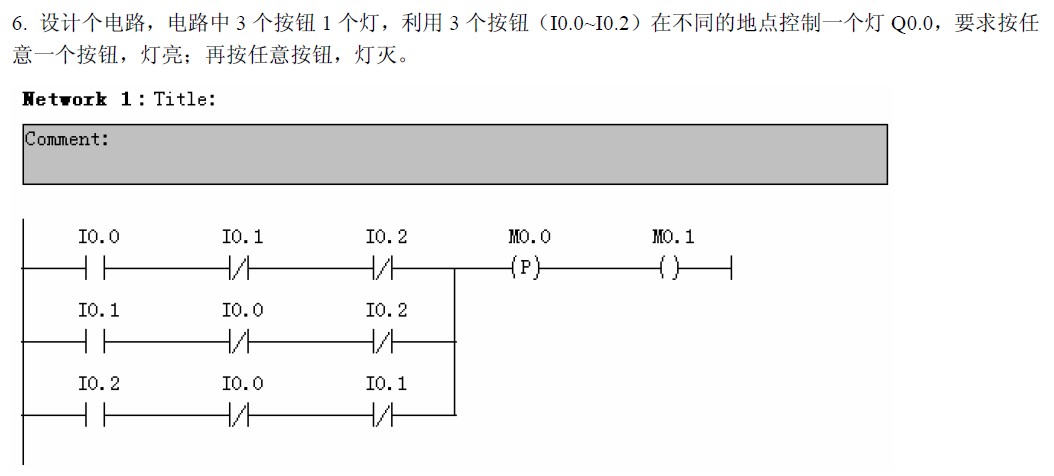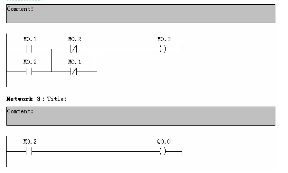 第二段的作用:這是一個單按鈕啟停的程序,M0.1ON一次,M0.2導通,M0.1再ON一次,M0.2斷開。實現(xiàn)題目中的“按一次燈亮,再按一次燈滅”的功能。