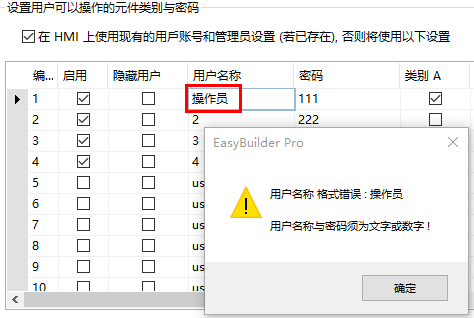 如題所述,威綸通HMI在權限設置中,用戶名稱設置的時候,輸入中文保存時,會顯示出錯的彈窗,是本身不支持中文用戶名,還是其它地方設置有問題?如果能設置中文用戶名,該怎么操作?求大神指點。