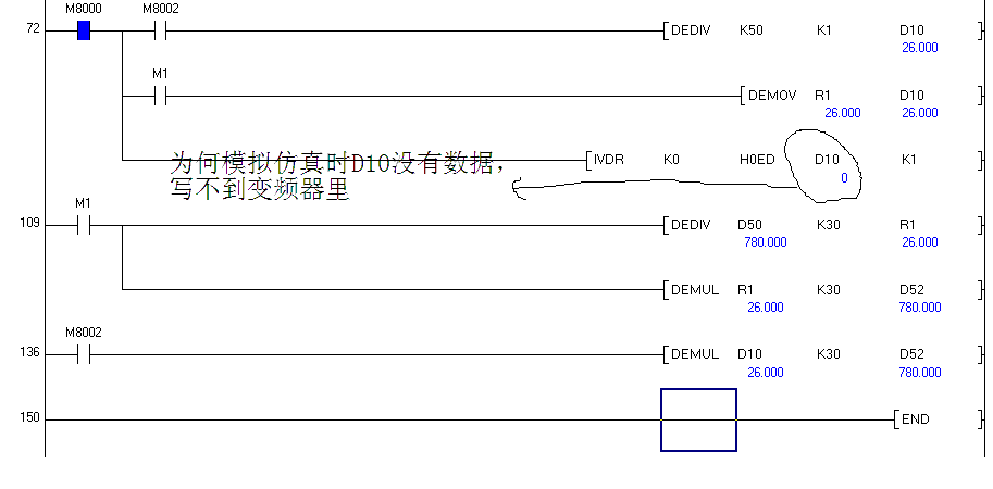 為什么這個(gè)程序不能在觸摸屏上寫入速度,試了很多次,也改了很多次。開始的時(shí)候三菱FX3U-PLC和GX-1275觸摸屏沒到貨,只能在電腦上模擬聯(lián)通,沒達(dá)到預(yù)期效果,聽三菱客服說(shuō)可以的,最近產(chǎn)品到了我試了幾次還是不行。我想在觸摸屏上改變變頻器的速度,上面的那個(gè)程序只能改變頻率,所以我就把程序做了相應(yīng)修改,我想讓在觸摸屏上輸入速度從而改變變頻器的頻率已達(dá)到改變速度。我試了好多次開始改變觸摸屏上速度,實(shí)在只能改變成30的整數(shù)倍,很無(wú)奈。哥們先幫我分析分析問(wèn)題出在那?“我也試過(guò)實(shí)數(shù)指令,沒效果”