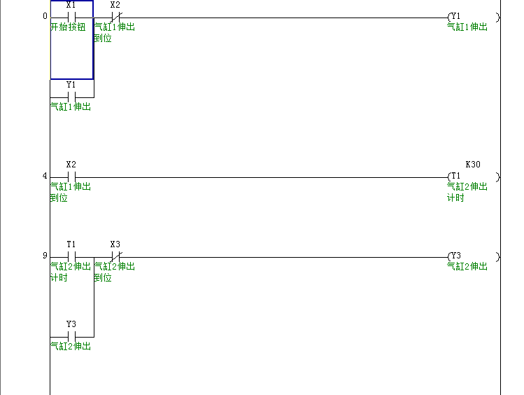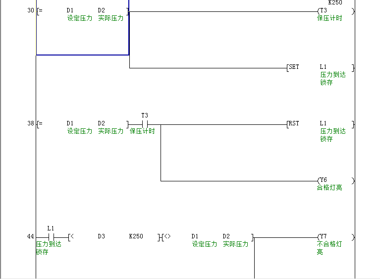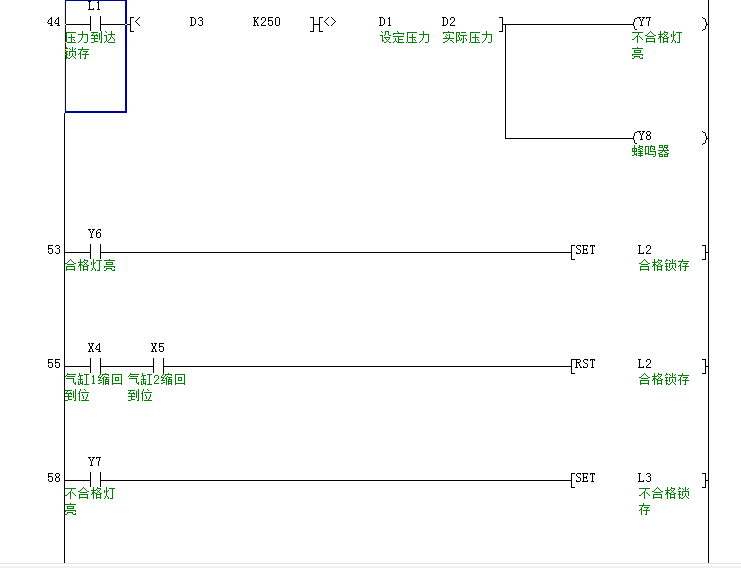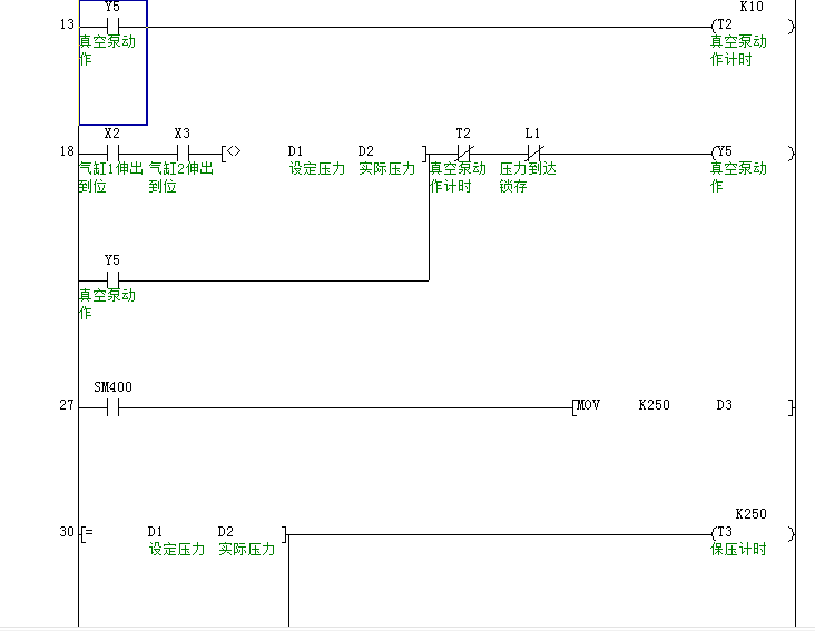 控制要求:(連體)按下開始按鈕,由電磁閥控制的氣缸1開始動(dòng)作(向下密封住口1),3秒后由電磁閥控制氣缸2動(dòng)作。密封好后,真空泵抽真空規(guī)定在10秒內(nèi)真空度達(dá)到設(shè)定值后停止真空泵停止抽真空(此值可由觸摸屏設(shè)定)保壓25秒,在25秒壓力值不變則合格顯示燈發(fā)亮,否則不合格燈亮并有蜂鳴器報(bào)警。無論合格與否,在顯示燈亮的同時(shí)電磁閥泄壓,只有當(dāng)壓力值小于10Pa時(shí)電磁閥控制兩氣缸同時(shí)縮回。在此過程中顯示屏記錄檢測時(shí)間,檢測數(shù)量,合格數(shù),不合格數(shù),合格率,壓力值。此信息可由USB插口傳送到其他硬盤。