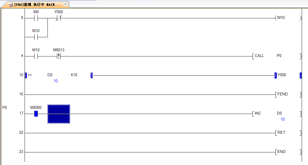 一個簡單的子程序樣例,子程序要寫在主程序之后(FEND指令以后),子程序號在梯形圖左側(cè)點擊輸入(如P0、P10),子程序結(jié)束輸入RET,所有程序結(jié)束END。