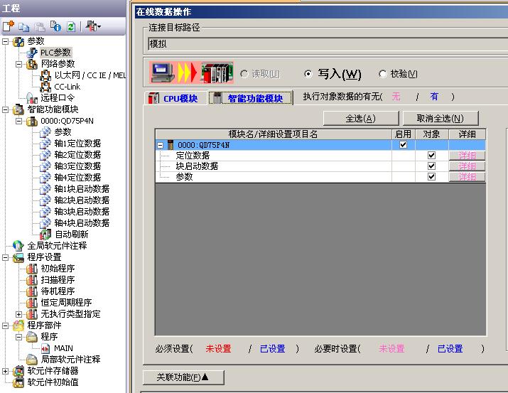 你好,我用關系GX Works2代替QP設置參數(shù),怎么寫進PLC? 當我用PLC寫入的時候只能寫進程序,智能模塊設置的參數(shù)寫不進去,每當我在寫入PLC的時候有個智能功能模塊給你選擇,但點進去以后里面都是灰色的,什么都沒有,也無法寫入。這是什么問題?該怎么解決。而且在讀PLC的時候,QP參數(shù)也讀不出來,最多只能讀出一個自動刷新的參數(shù)