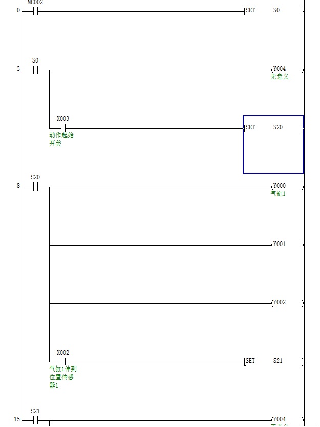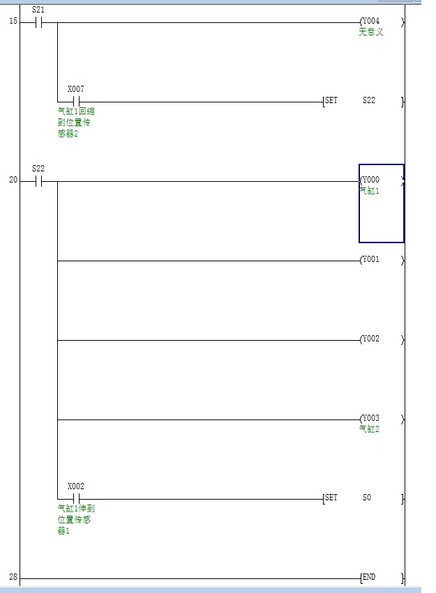 6.氣缸Y000伸出到達x002感應開關時,Y00,Y001,Y002縮回;Y000,縮回至X007時,Y003縮回;