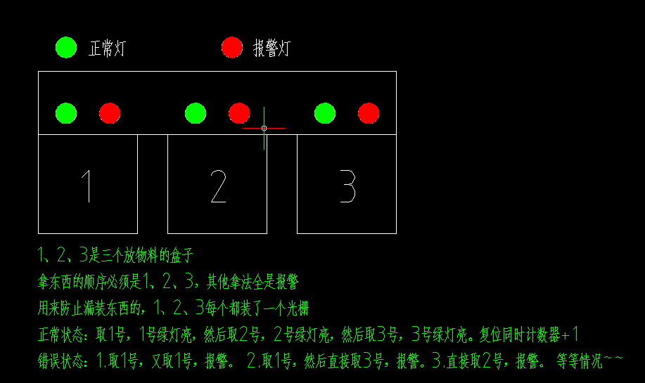 圖中是用手到3個物料箱里拿物料的,手進物料箱,對應箱子里的光柵就感應到給個信號。