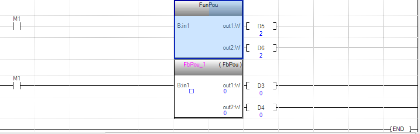 上面一個是函數,下面一個是功能塊,里面都是輸入ON就給兩個輸出賦值2,寫到PLC里面閉合M1之后4個輸出都變成2,然后把PLC開關打到STOP再打到RUN,D5,D6在沒有輸入的情況下就從0變成2了是什么原因