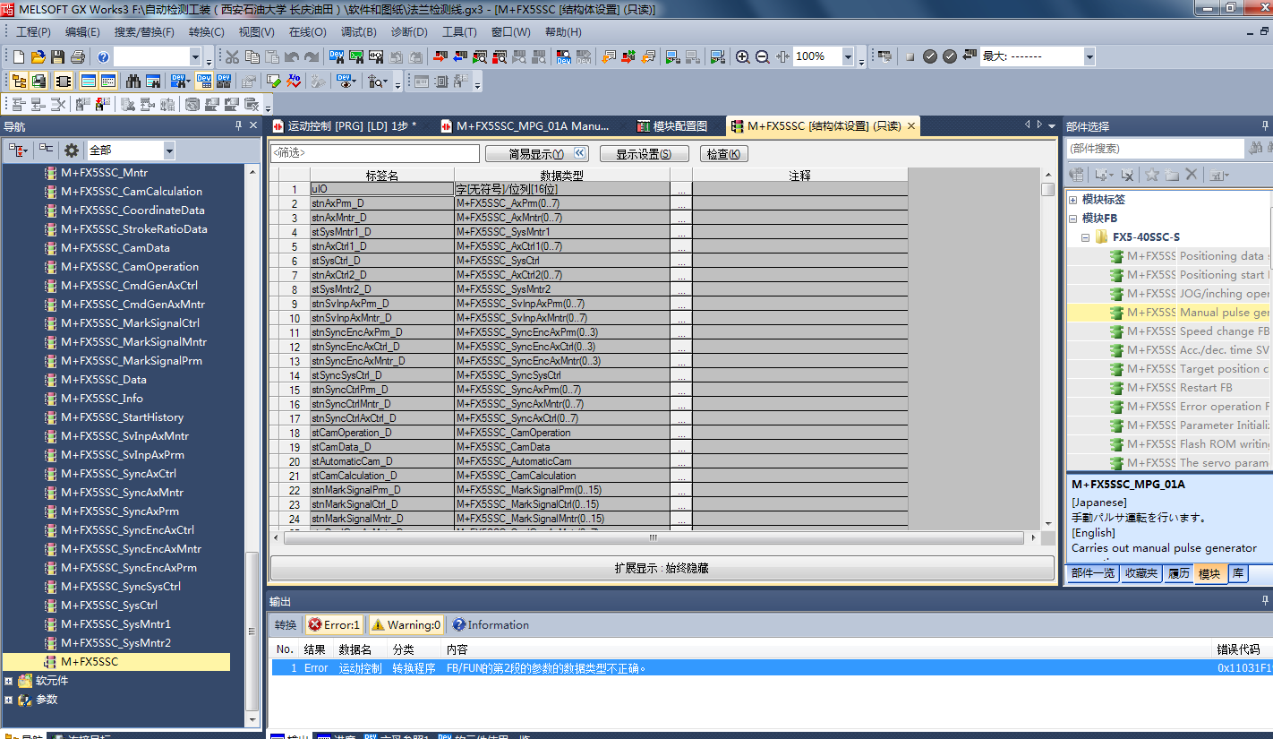 大家好,最近需要做一個工程,感覺FX5U的PLC 使用FX5SSC的簡易運動模塊孔子比較方便,畢竟可以光纖總線控制,驅動器上接線方便。可是在使用時,發現這個 FB不太好用,配置了FX5-40SSC-S模塊后,本想在lad里面插入FB(FX5-40SSC-S對應的 脈沖手輪控制FB),插入后,定義FB的輸入時,有個 輸入點,類型為DUT(結構體),不知如何賦值?請用過的朋友,幫忙指導,謝謝