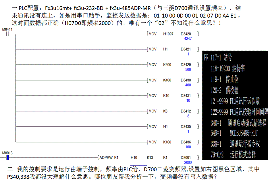 1   FX3U-485APT-MB與 D700變頻器通訊不上:我設置的頻率是2000于是我用串口助手讀取了發的數據: 01 10 00 0D 00 01 02 07 D0 A4 E1  我的理解依次是  01變頻器站號 , 10是寫入數據命令 , 00 0D 三菱變頻器的頻率設定地址,00 01 寫入寄存器的個數為1,07 D0則是我設定的頻率2000,