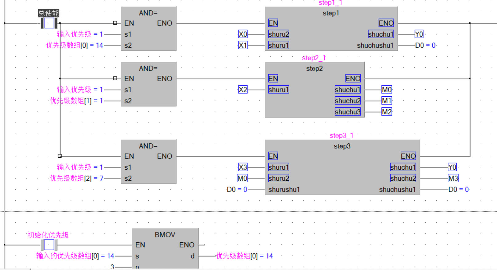 D0~D3里面填各工序的序號(hào),另外開辟一個(gè)空間存儲(chǔ)當(dāng)前的步號(hào),每個(gè)任務(wù)結(jié)束以后都將步號(hào)+1,執(zhí)行下一個(gè)D里面存儲(chǔ)的工序編號(hào),整個(gè)系統(tǒng)不就串聯(lián)起來了