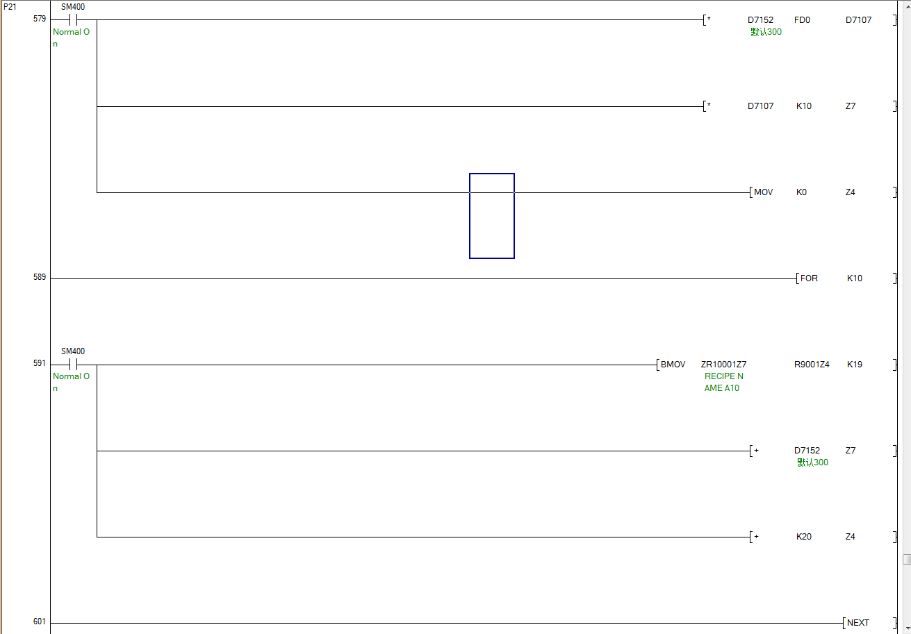 如圖P21子程序是一個設備的recipe在觸摸屏上的列表顯示的算法,上下頁控制,一頁顯示10個,一個recipe存儲占300字。 原程序只可以保存60個配方,就是6頁,這個算法沒問題,但是現在由于配方增多,需要擴充,源程序不改的話當超過11頁后也就是Z7會算到33000,Z7一個字最大范圍-32768~32768,然后PLC就報錯了,這個需要怎么改呀,需求是改到能有100頁,也就是1000個容量。 |