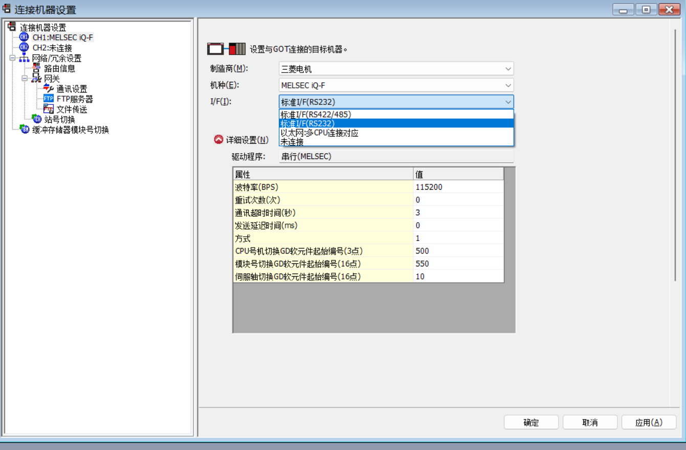 看你是跟什么PLC通訊?跟FX5U就設成以太網,串口的就設232。