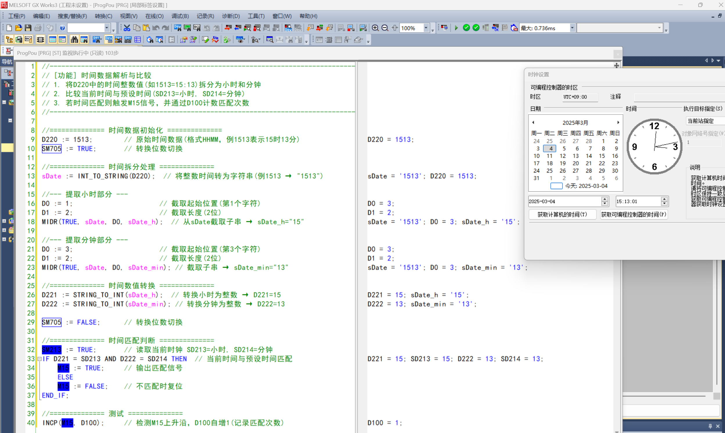附件是摘抄的部分程序,D220是時鐘設定寄存器,設定數1513表示15:13分鐘后M15輸出,模擬時沒有變化,D5是怎么來的沒有搞清楚