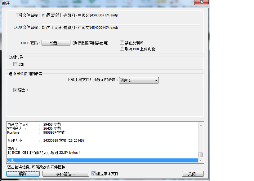 威綸通觸摸屏在編譯的時候出現(xiàn),此EXOB和韌體檔案超過22.5M,轉(zhuǎn)換失敗,