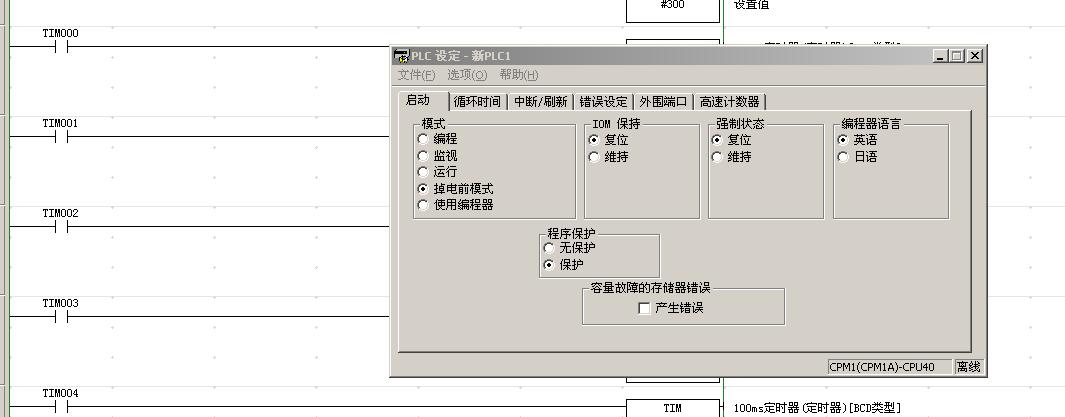 由于剛學習歐姆龍的PLC,型號是CPM1A-40CDR-A,我把編程好的新程序傳送到PLC里面,老是有錯誤,之前我對PLC改動了一下,把運行模式改為掉電前模式,現在就出了這個問題,現在老的程序也不在運行狀態了(PLC的運行指示燈不亮),把PLC斷過電之后,然后送電,這樣PLC的運行指示燈就亮了,老的程序才能運行,但我把新的程序傳到PLC里面,傳送不上去,請問各位老師是不是PLC設置哪里出問題了!請賜教!