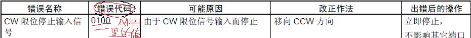 Sorry,我的表述有問題,舉個(gè)例子,電機(jī)的極限感應(yīng)器壞了處于常on狀態(tài),這時(shí)我進(jìn)行找原點(diǎn)操作后PLC報(bào)警,如果是0脈沖輸出的話A444地址里有一個(gè)數(shù)字,我如何在不知道此感應(yīng)器是壞的前提下查出所對(duì)應(yīng)的PLC異常?CP1H op manual W450-CN5-02操作手冊(cè)里貌似查不到啊!