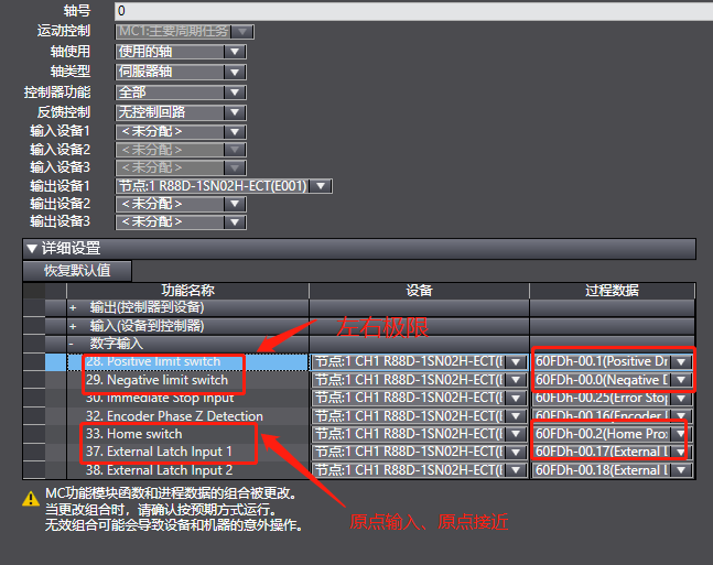 在軸“基本設置”的“詳細設置”里,分配Home switch(原點接近信號)和External Latch Signal1(原點輸入信號)的對應數字輸入。。