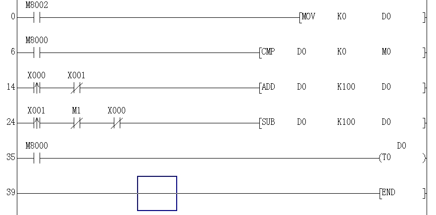M8000初始化D0,若D0的值等于0則不能再減小,X0每接通一次定時器增加1S,X1接通一次定時器減少1S。