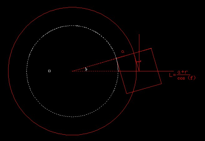 如圖,r是砂輪半徑,a是某一面距離材料中心的距離(這個參數是需要設置,如果是規則圖形也可根據其他參數算出),f是材料旋轉角度(當然起始位置不一樣起始角度也是不一樣,本文僅以從面的中間向兩邊磨的順序說),中心距是L,如圖所示算法
