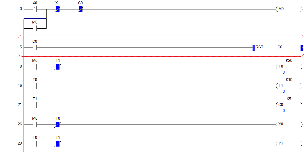 我寫的梯形圖如上圖,調(diào)試時,到C0到5時,Y1與Y2停下來后,重新啟動x0就不能重新啟動循環(huán)了,得斷電才行,請問要用什么條件來使CO rst?