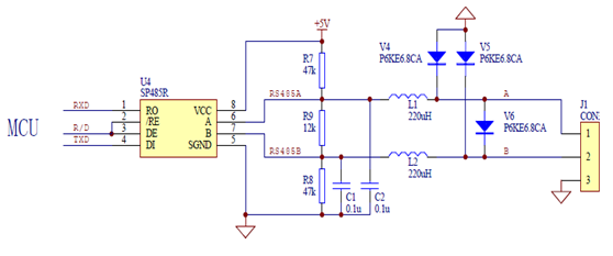 連接至A 引腳的上拉電阻R7、連接至B 引腳的下拉電阻R8 用于保證無連接的SP485R芯片處于空閑狀態,提供網絡失效保護,以提高RS-485 節點與網絡的可靠性。
