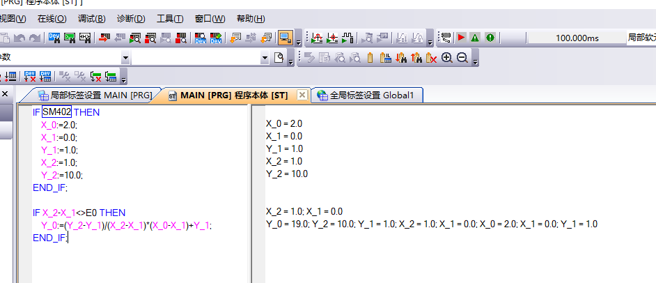 3、在初始化程序中增加一句 MOVE_E,讓除數不為零( X2 - X1 <> 0.0),CPU可以運行了,模擬也正常。