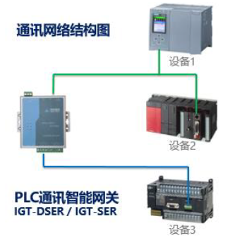 西門子PLC與三菱Q系列PLC跟智能網關之間是通過交換機以太網連接,網關參數軟件的電腦也是連接在這個交換機上;歐姆龍PLC跟網關之間是串口連接,如下圖: